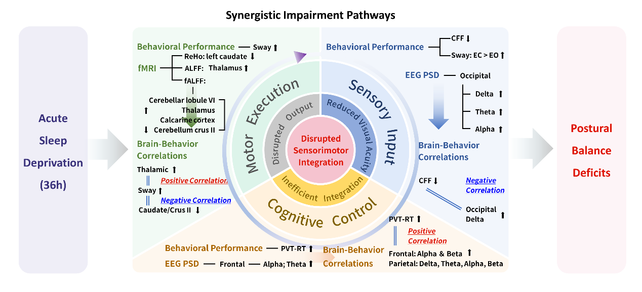 综合来看,该研究的多模态交叉验证支持了一个从感觉到运动的协同损害模型。急性睡眠剥夺首先损害视觉皮层功能,降低感觉输入的保真度,继而削弱额顶网络的认知控制效率,影响对感觉信号的整合与决策,最终波及运动执行环路,导致基底节-小脑回路的功能抑制和丘脑调控的紊乱。这三个层面的功能损害通过本研究揭示的显著相关性相互关联,表明睡眠剥夺以协同而非孤立的方式破坏了感觉运动整合通路的完整性,最终导致姿势平衡能力的全面下降。该研究为理解睡眠不足如何沿感觉输入、认知加工到运动输出的完整通路逐步瓦解姿势平衡提供了多层次的神经生物学证据,这些发现对于需要长时间保持清醒的职业群体(如军事人员、医护工作者和交通运输从业者)的安全管理具有重要参考价值,同时也为未来感觉运动训练和康复干预方案的设计提供了潜在的神经靶点。