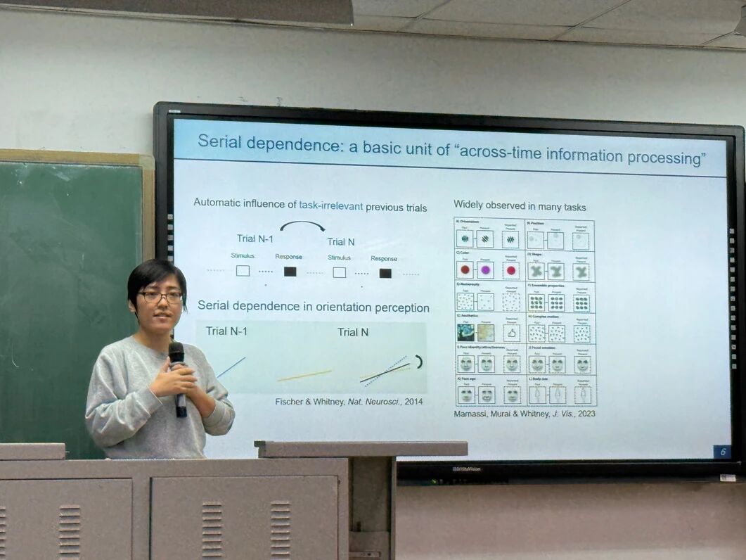 在此基础上,张老师介绍了团队开展的一系列研究工作,综合采用多种实验范式与神经解码分析,从行为与神经层面同时追踪过去信息如何被保留、在何时被调用以及以何种方式影响当前判断。整体结果显示,序列效应并非单一机制所致,不同信息成分及其在不同加工阶段的参与方式可能并不相同;过去信息也未必始终以持续活动形式存在,存在以静默方式保存并在关键时点再激活的可能性。