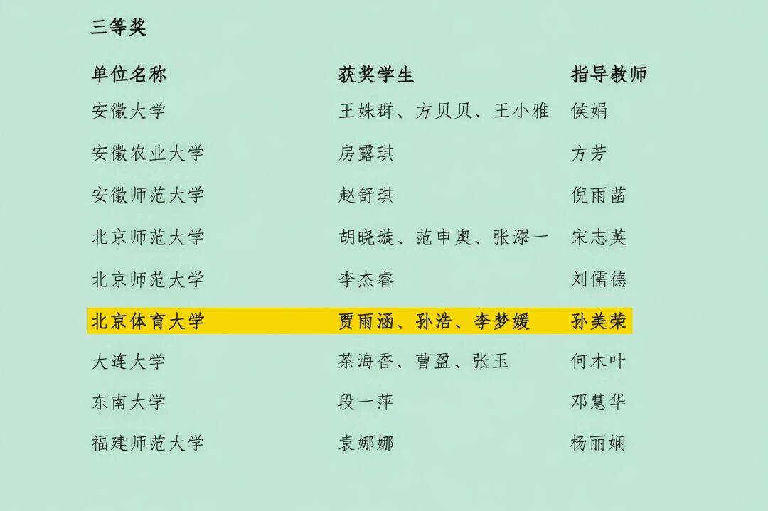 北京体育大学心理学院应用心理硕士三位研究生同学在应用心理案例开发比赛中,由贾雨涵、孙浩、李梦媛同学(指导教师:孙美荣)共同创作的作品,因内容殷实、富有创新、实践性强,荣获全国三等奖,展现了扎实的专业素养、出色的实践能力和昂扬的精神风貌。