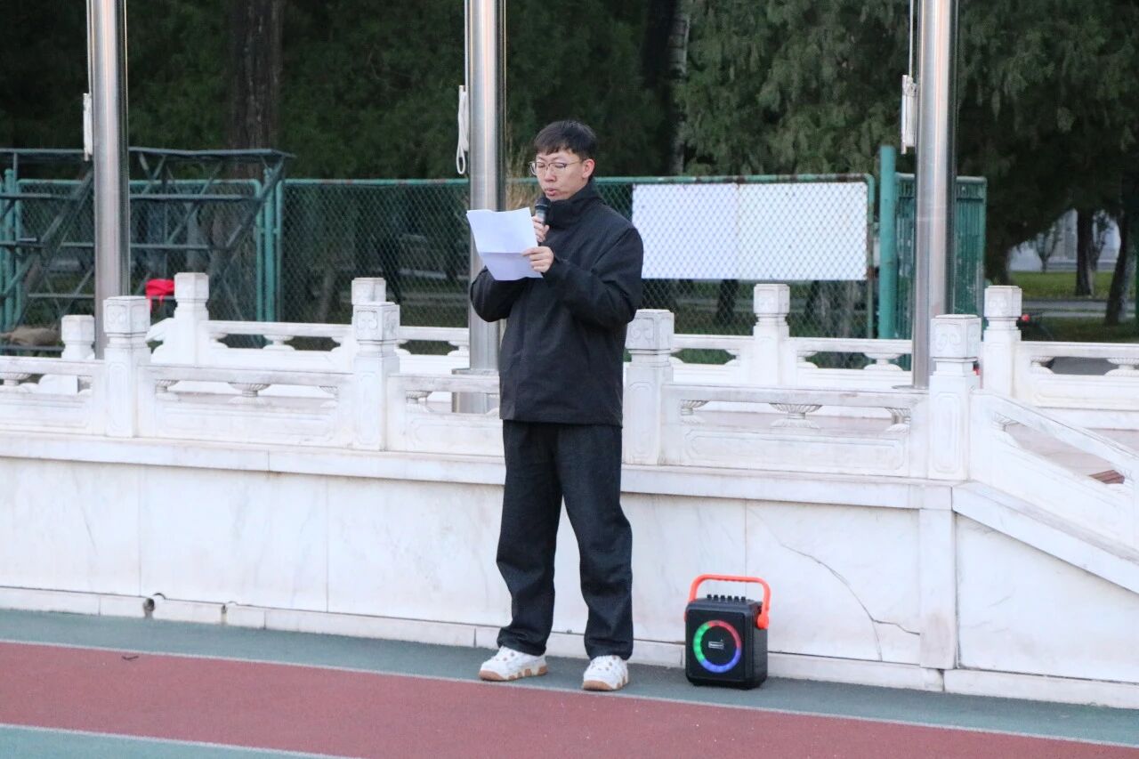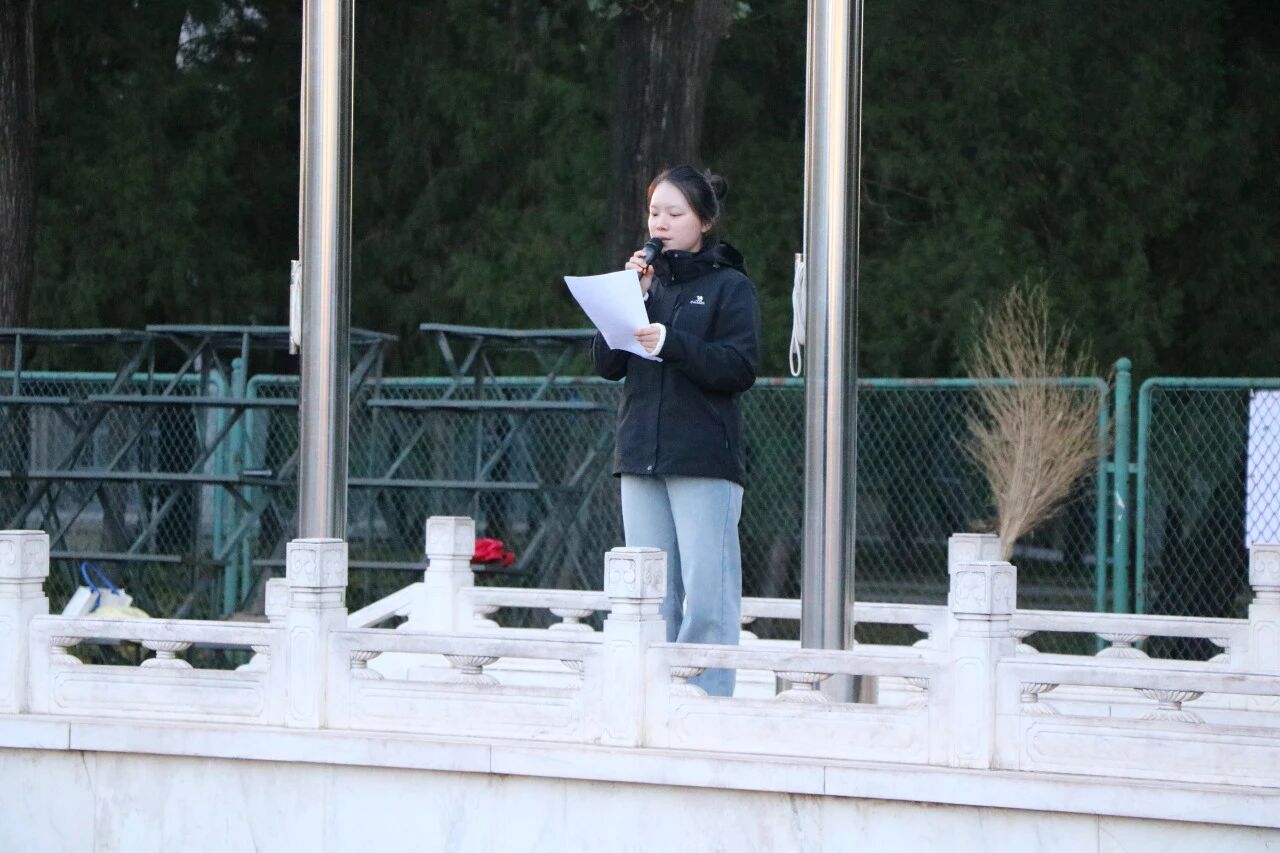 活动由周诺同学主持,现场秩序井然。当夜空褪去最后一抹墨色,远方天际漫开清亮的蓝,清脆的鸟鸣划破晨空,本次活动正式启幕。《义勇军进行曲》的雄壮旋律响起,五星红旗冉冉升起的瞬间,在场师生无不心潮澎湃、热泪盈眶。护旗步伐铿锵有力,每一个动作都是“躬行使命”的具象表达;目光凝望专注坚定,每一次注视都是“书写担当”的无声誓言。