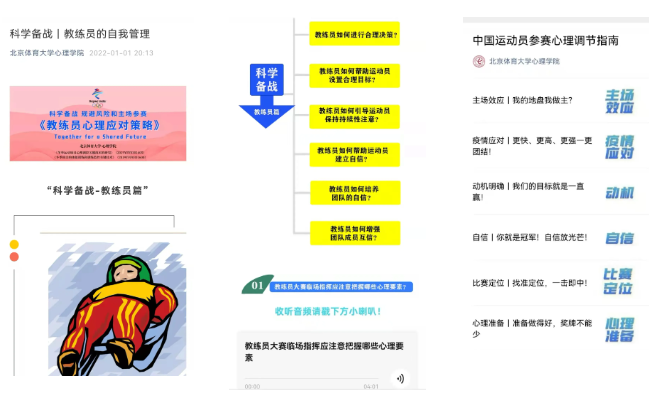 助力冬奥会心理调控系列专题包括三个板块,分别是《北京冬奥会中国运动员参赛心理调节指南》、《科学备战、规避风险和主场参赛运动员心理应对策略报告》和《科学备战、规避风险和主场参赛教练员心理应对策略报告》。