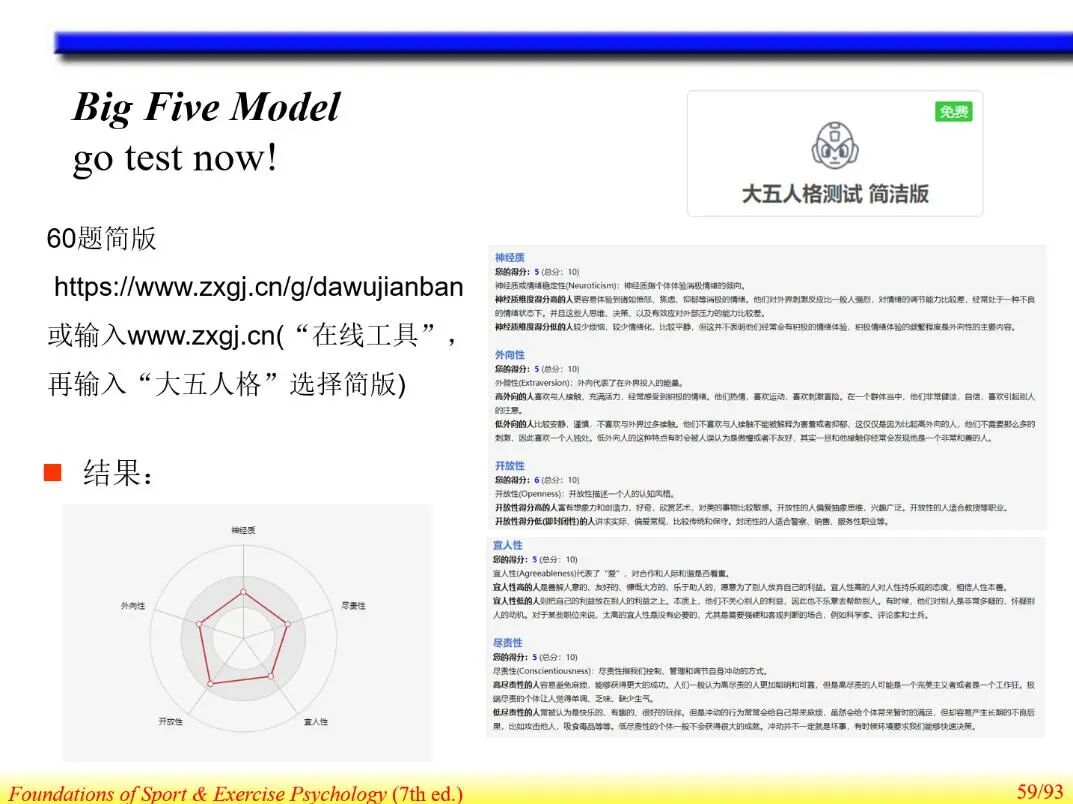 课程课件坚持以国际经典教材为基础,结合我国体育事业发展需求和运动心理学学科前沿,构建了“中英结合、全球视野与本土情境融合”的内容体系。课件注重课程思政与学术规范引导,弘扬体育精神,强化职业责任意识;同时运用“雨课堂”等信息化教学手段,增强课堂互动与即时反馈,不断提升教学实效。