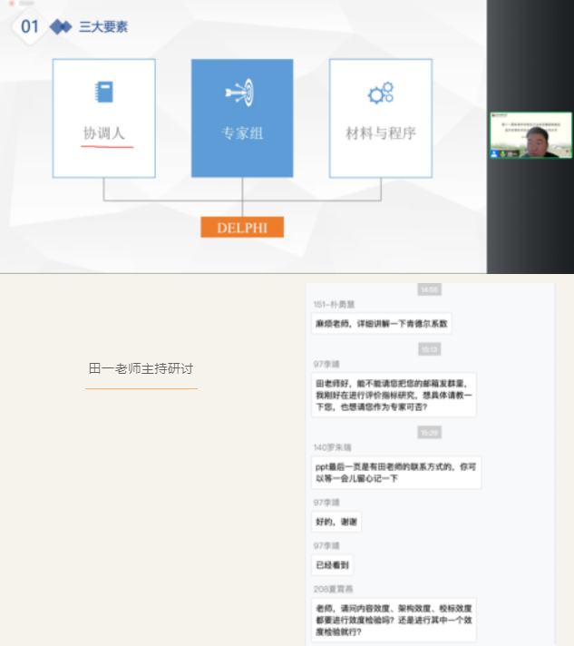 田一老师的研讨以“如何正确应用德尔菲法?”为主题展开。德尔菲技术由具有相关专业知识的参与者小组匿名顺序地回答问卷,每次问卷调查后,小组的回答都会反馈给参与者,经过多轮调查分析,最终达成专家共识。在讲解了经典应用和德尔菲法的优缺点之后,田一老师介绍了德尔菲法的三大要素、四大特点、五大注意,并详细介绍了使用德尔菲法进行研究的方法步骤,用真实的案例讲解了整个流程,介绍了他们团队研究所得结论在教育领域具有良好的效度。最后对德尔菲法未来的应用前景进行了展望,并回答了各位学员的问题。