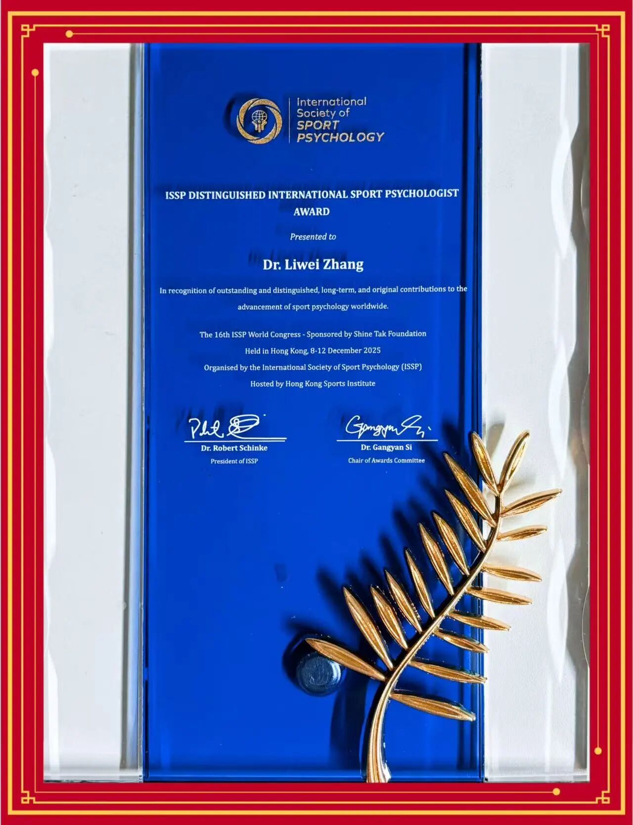 2025年12月8日至12日,国际运动心理学会第十六届世界大会在中国香港举行。会上,国际运动心理学学会评奖委员会宣布“杰出国际运动心理学家奖”授予北京体育大学心理学院张力为教授,并由国际运动心理学会主席Robert J. Schinke教授为其颁奖,学院葛杨老师代为领奖。之后,张力为教授通过视频形式发表了获奖感言,12分钟的发言赢得了现场各国学者的掌声和致意!